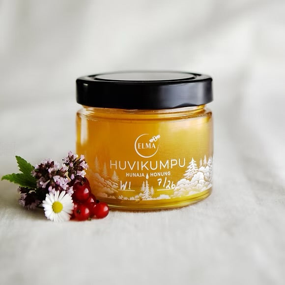 Huvikumpu" -hunajamme on kotoisin monipuolisesti kukkivista puutarhoista Porin Liinaharjasta ja Hevosluodon siitolapuutarhoilta sekä Söörmarkun kylästä.